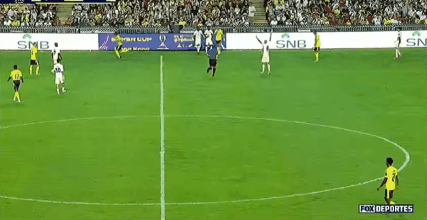 16’迪亚比反越位面对本托横敲,贝尔温推射破门,吉达联合1-1扳平利雅得胜利