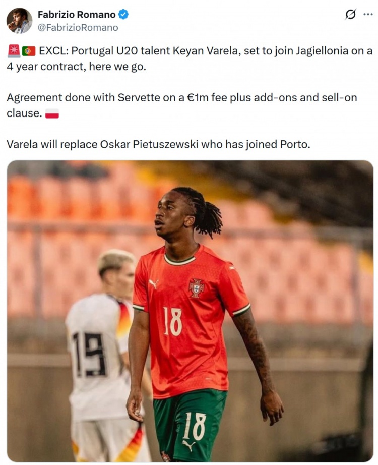 1月17日讯 据知名记者罗马诺报道,19岁葡萄牙边锋瓦雷拉将加盟波兰甲级联赛俱乐部乔治罗尼亚,Here we go!罗马诺透露,乔治罗尼亚已经敲定从塞尔维特引进瓦雷拉的交易,转会费100万欧加浮动奖金,还有转售分成条款。乔治罗尼亚将与瓦雷拉签约四年,他们将瓦雷拉视为皮图谢夫斯基的替代者,后...